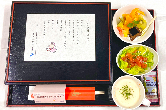 このお祝い膳は、当院看護部のマスコットキャラクター「こころ」にちなんで名付けられたもので、お品書きとお祝いのメッセージカードを添えてお届けしています。