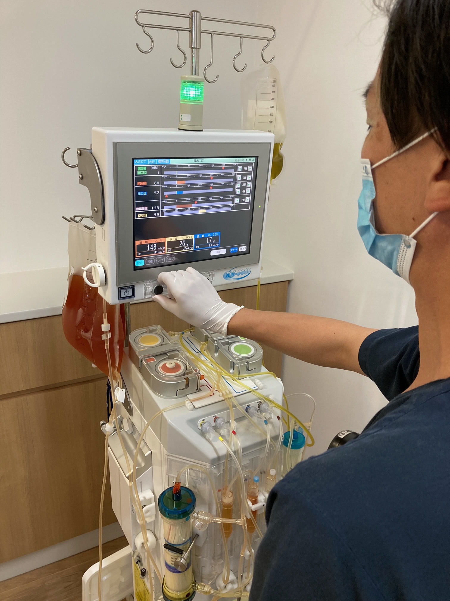 血液透析・血液濾過透析・血漿交換・血液吸着・白血球除去、腹水濾過濃縮再静注法などを行っています。バスキュラーアクセスへの穿刺はエコー下穿刺を含め臨床工学技士が積極的に実施しています。重症患者さんに対する急性血液浄化療法には24時間対応しています。