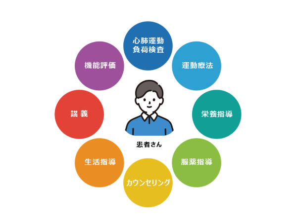 一般的なリハビリテーションは身体機能・精神機能の維持、向上を目的に行われますが、心臓リハビリテーションはそれに加えて『心臓病の再発・再入院予防、死亡率減少』が目的になっていることが特徴です。疾病管理の要素が大きく、この目的を達成するために運動療法に加えて栄養・食事指導、服薬指導、生活指導、禁煙指導、カウンセリング、復職相談などを多職種(看護師、理学療法士、作業療法士、薬剤師、管理栄養士、臨床心理士、医師など)にて行います。